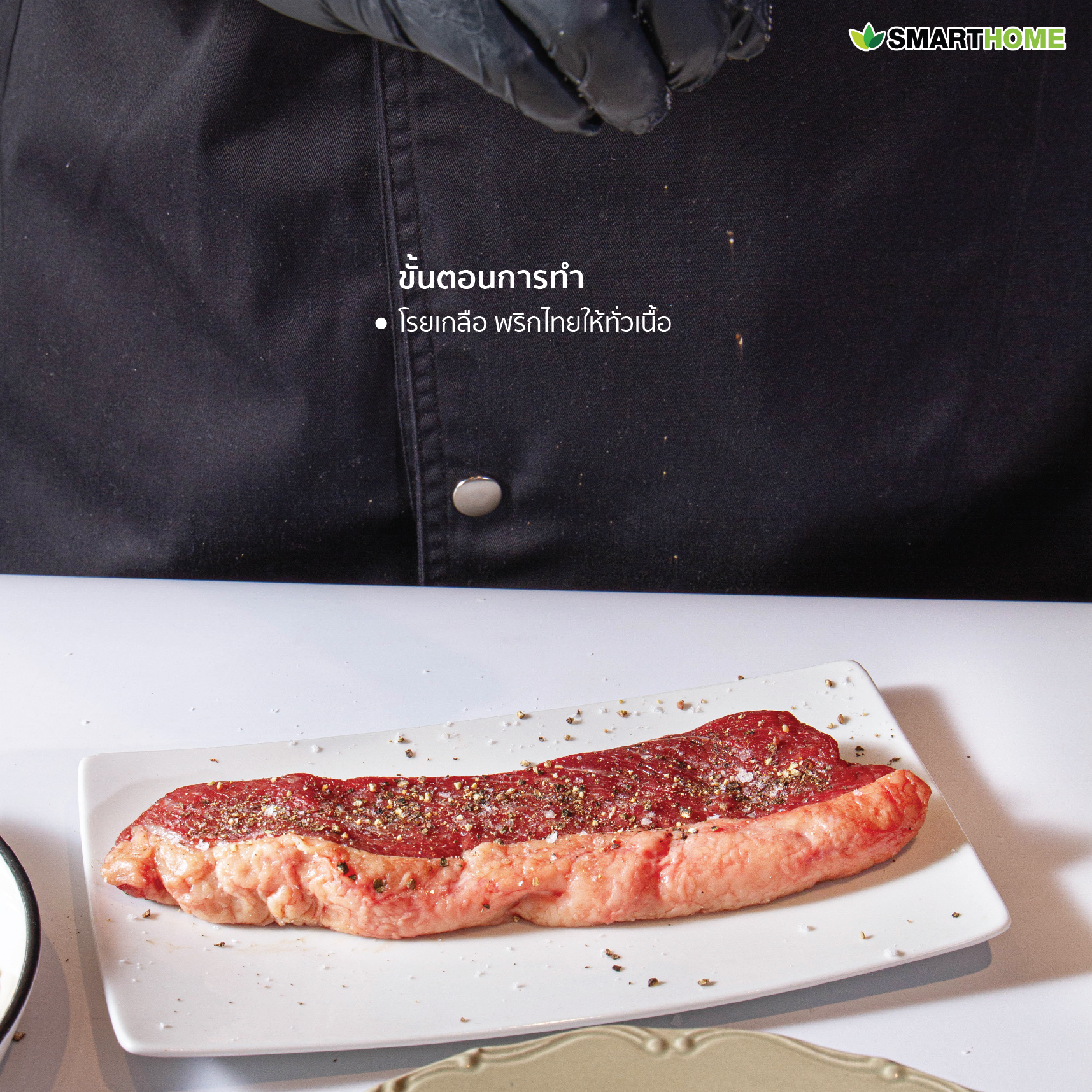 เริ่มจากโรย เกลือและพริกไทยดำ ให้ทั่วเนื้อทั้งสองด้าน เพื่อเพิ่มรสชาติให้กับเนื้อ