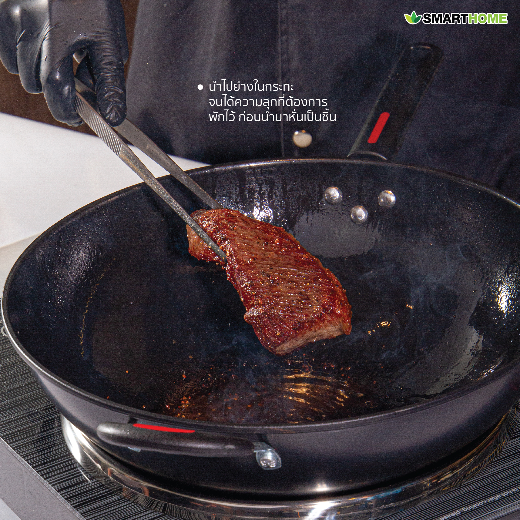 จากนั้นตั้งกระทะบน เตาแม่เหล็กไฟฟ้า SMARTHOME ใส่น้ำมันพืชเล็กน้อยแล้วนำเนื้อพิคาน่าลงย่าง ย่างจนได้ระดับความสุกตามต้องการ จากนั้นพักเนื้อไว้ประมาณ 3–5 นาที เพื่อให้เนื้อคลายความร้อนและเก็บน้ำในเนื้อไว้ ก่อนนำมาหั่นเป็นชิ้นพอดีคำ
