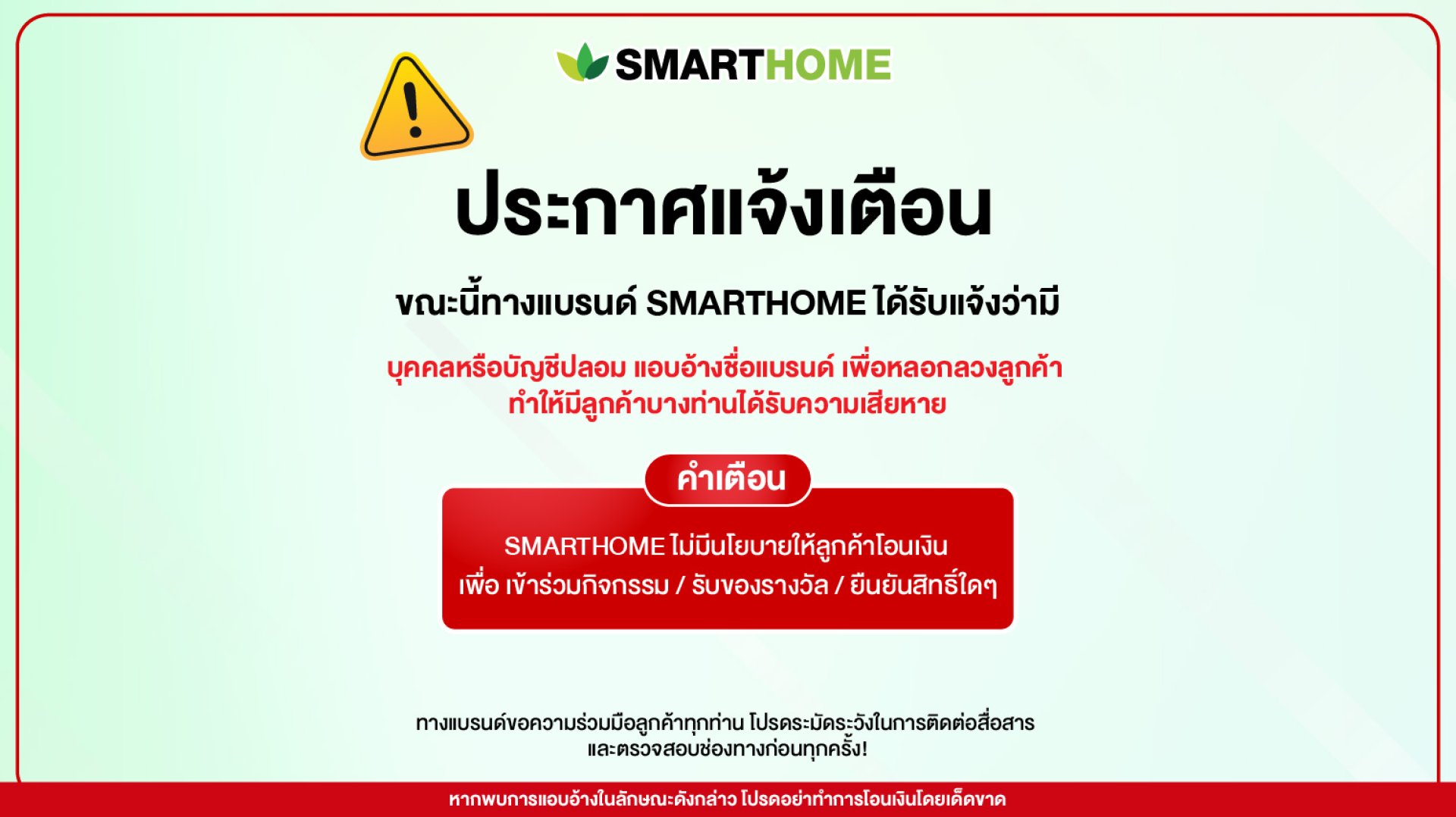 โปรดอย่าทำการโอนเงินโดยเด็ดขาด และควรตรวจสอบข้อมูลกับช่องทางทางการของ SMARTHOME ก่อนทุกครั้ง